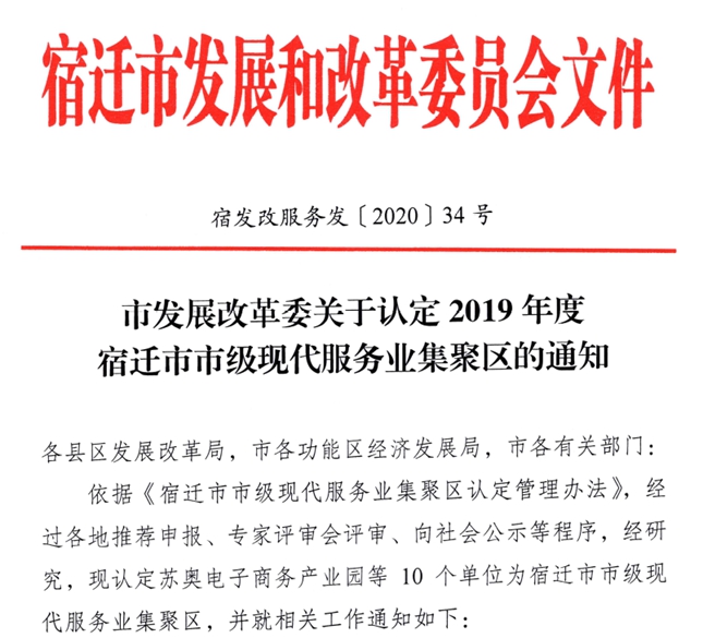 近日,根據(jù)《市發(fā)展改革委關于認定2019年度宿遷市市級現(xiàn)代服務業(yè)聚集區(qū)的通知》,蘇宿園區(qū)生產(chǎn)力中心成功創(chuàng)成宿遷市市級現(xiàn)代服務業(yè)聚集區(qū)。