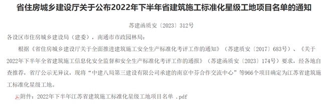 近期,省建設廳下發(fā) 《 關于公布2022年下半年江蘇省建筑施工標準化星級工地公示名單 》的通知,城發(fā)公司投資建設的青年公寓一期土建及安裝工程喜獲“江蘇省建筑施工標準化星級工地”(二星)稱號。該榮譽的獲得是公司扎實推進省安全生產標準化建設,落實上級關于推進安全生產標準化建設工作部署的要求,建立健全管理機制,積極開展安全文明標準化工地創(chuàng)建所取得的成果,為全省樣板化示范,有效提升建筑施工水平,安全生產發(fā)揮了引領作用。
