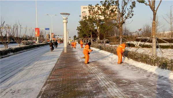 清晨6時(shí),市政部工作人員和環(huán)衛(wèi)工人已經(jīng)開(kāi)始對(duì)轄區(qū)部分主要路段進(jìn)行除雪除冰作業(yè)。在凜冽寒風(fēng)中,他們不畏嚴(yán)寒,經(jīng)過(guò)近3 小時(shí)的清掃除冰,截至當(dāng)天上午9時(shí),青海湖西路、通達(dá)大道、紫金山路等主干道及蘇州公園人行道已基本完成路面積雪清掃。